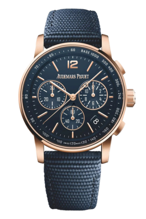 Shop Audemars Piguet Code 11.59 26393OR, Chronograph, 18K Rose Gold, Blue Index Dial, 41 mm