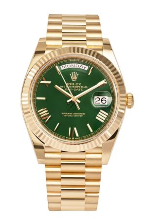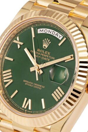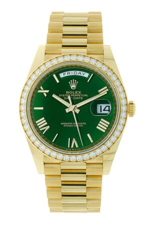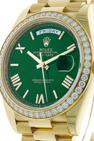Shop Rolex Day-Date 40 228348RBR, 18K Yellow Gold, Diamond Bezel, Green Roman Dial, 40 mm