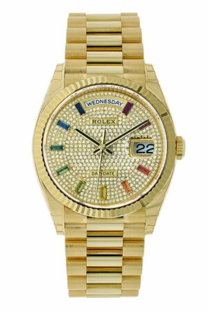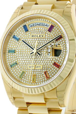Rolex Day-Date 36 128238, President, 18K Yellow Gold, Rainbow Baguette