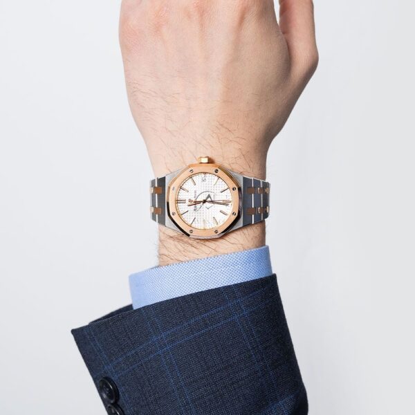 Designed for both style and practicality, the Royal Oak 15450SR boasts a water resistance of 50 meters (164 feet), showcasing versatility for daily wear and providing a touch of assurance against life’s elements.