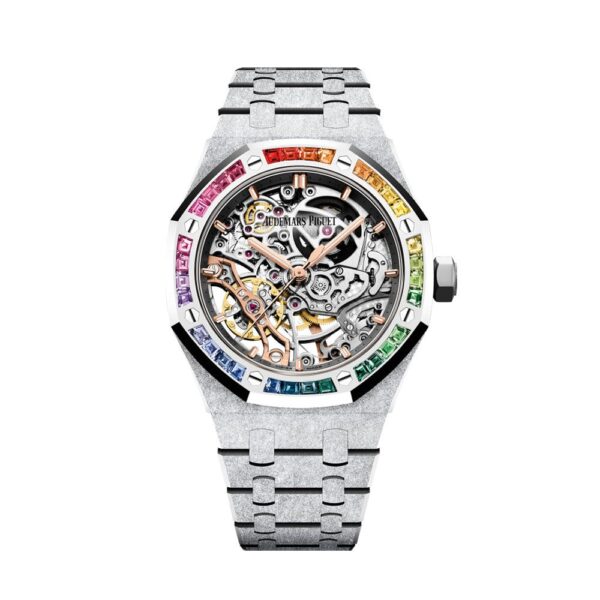 The Audemars Piguet Royal Oak 15468BC showcases a Frosted 18K White Gold design, adorned with a Rainbow bezel featuring 32 individually cut baguette-cut rainbow-coloured sapphires (2.24 carats), adding a vibrant touch to the 37 mm timepiece. The hammered 18-carat white gold case and bracelet exude elegance and sophistication. Encased in glareproofed sapphire crystal and caseback, the watch features a screw-locked crown for added security. Its rhodium-toned openworked dial showcases pink gold applied hour-markers and Royal Oak hands with luminescent coating, offering functions including hours, minutes, and centre seconds. Powered by a selfwinding mechanism, the watch boasts a 45-hour power reserve, combining style with reliable performance.