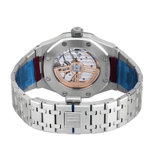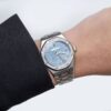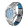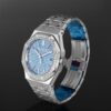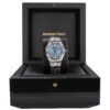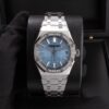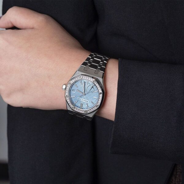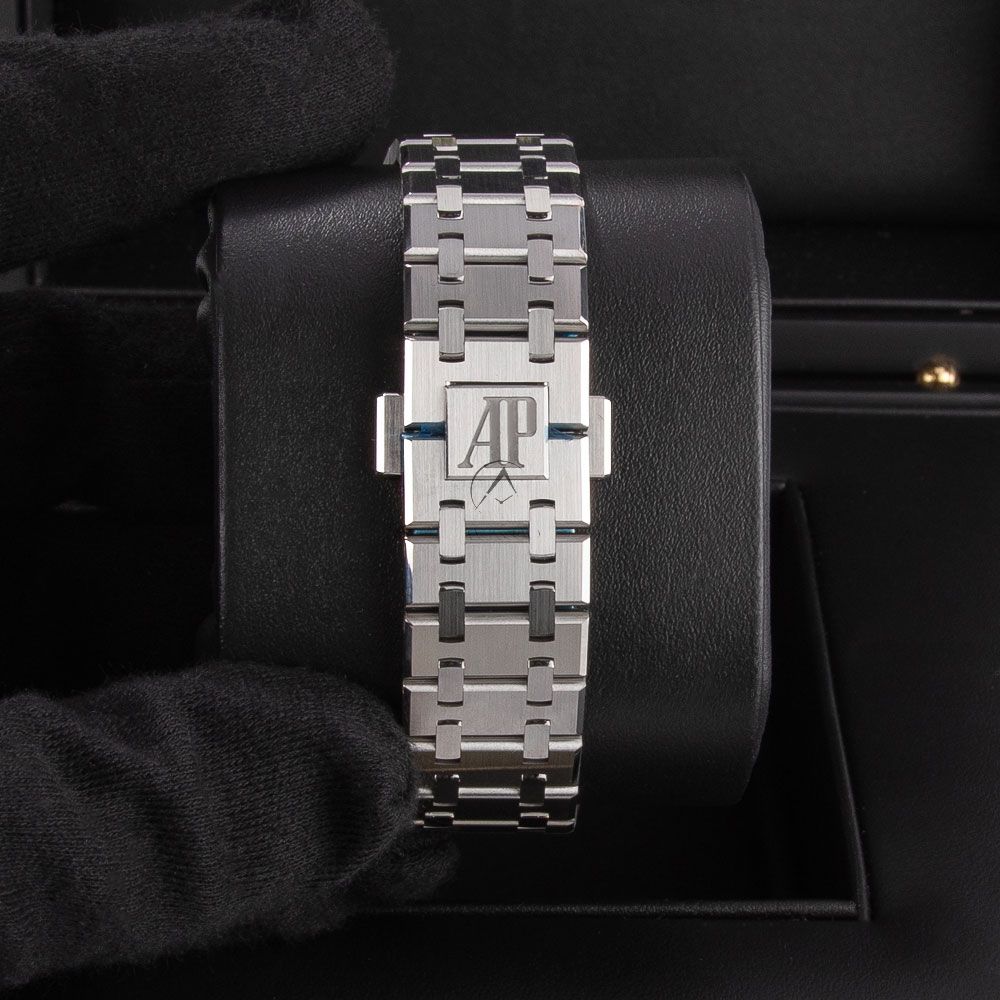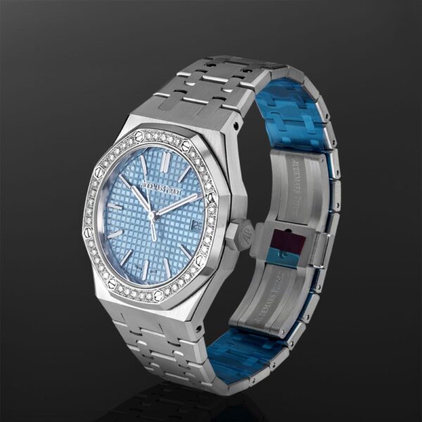 The Audemars Piguet Royal Oak, Ref. 15551ST.ZZ.1356ST.05, is a timeless symbol of sophistication and craftsmanship. It is made of durable stainless steel and exudes understated luxury at every glance. The blue dial is captivating, and the diamond bezel adds an element of prestige to its 37mm case, dazzling with its brilliance. This Royal Oak watch has a water resistance of 50 meters, making it both stylish and practical. Its precision engineering is matched by the iconic octagonal bezel, showcasing Audemars Piguet’s commitment to exquisite design and functionality.