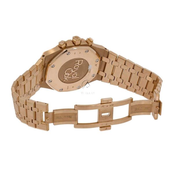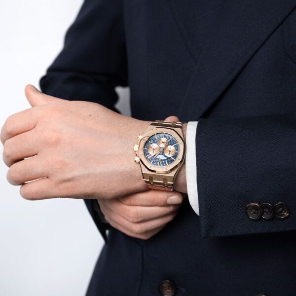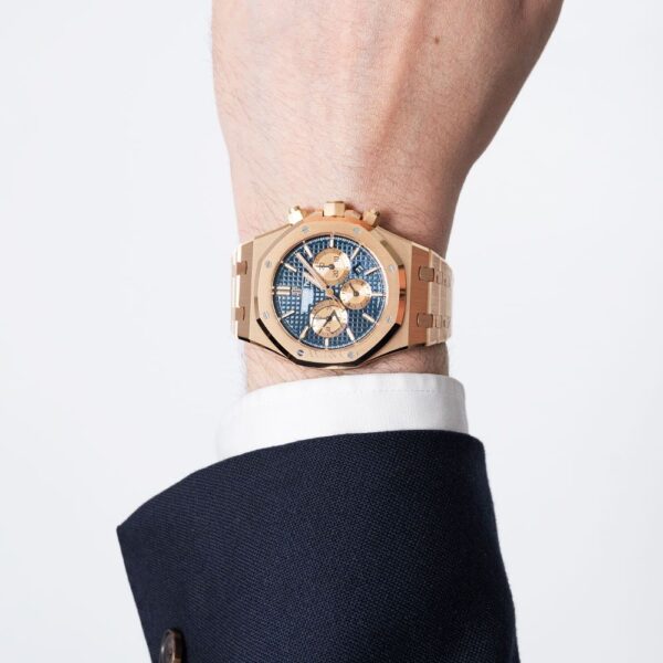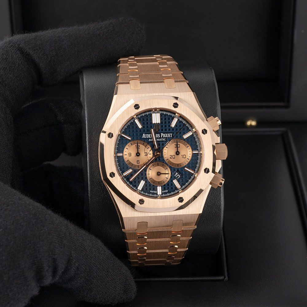 The Audemars Piguet Royal Oak 26331OR.OO.1220OR.01 combines modern colors of rose gold and saturated blue to deliver beauty. It features an 18-carat rose gold 41mm case with a glare-proof sapphire crystal, a solid case back, and a screw-locked crown. The blue dial has a Grande Tapisserie pattern, rose gold counters and hour-markers, and Royal Oak hands with luminescent coating. It is powered by the self-winding caliber 2385, which provides a chronograph, small seconds, and date functionality with a power reserve of 40 hours. The watch comes with a rose gold bracelet with a fold-over clasp and has a water resistance of 50 meters (164 feet).
