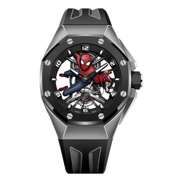The Audemars Piguet Royal Oak Concept 26631IO, Tourbillon “Spider-Man” timepiece showcases an impressive feat of skeletonization. In collaboration with Marvel, this watch pays homage to Spider-Man, who seems suspended from the dial as he traverses through the tourbillon mechanism.