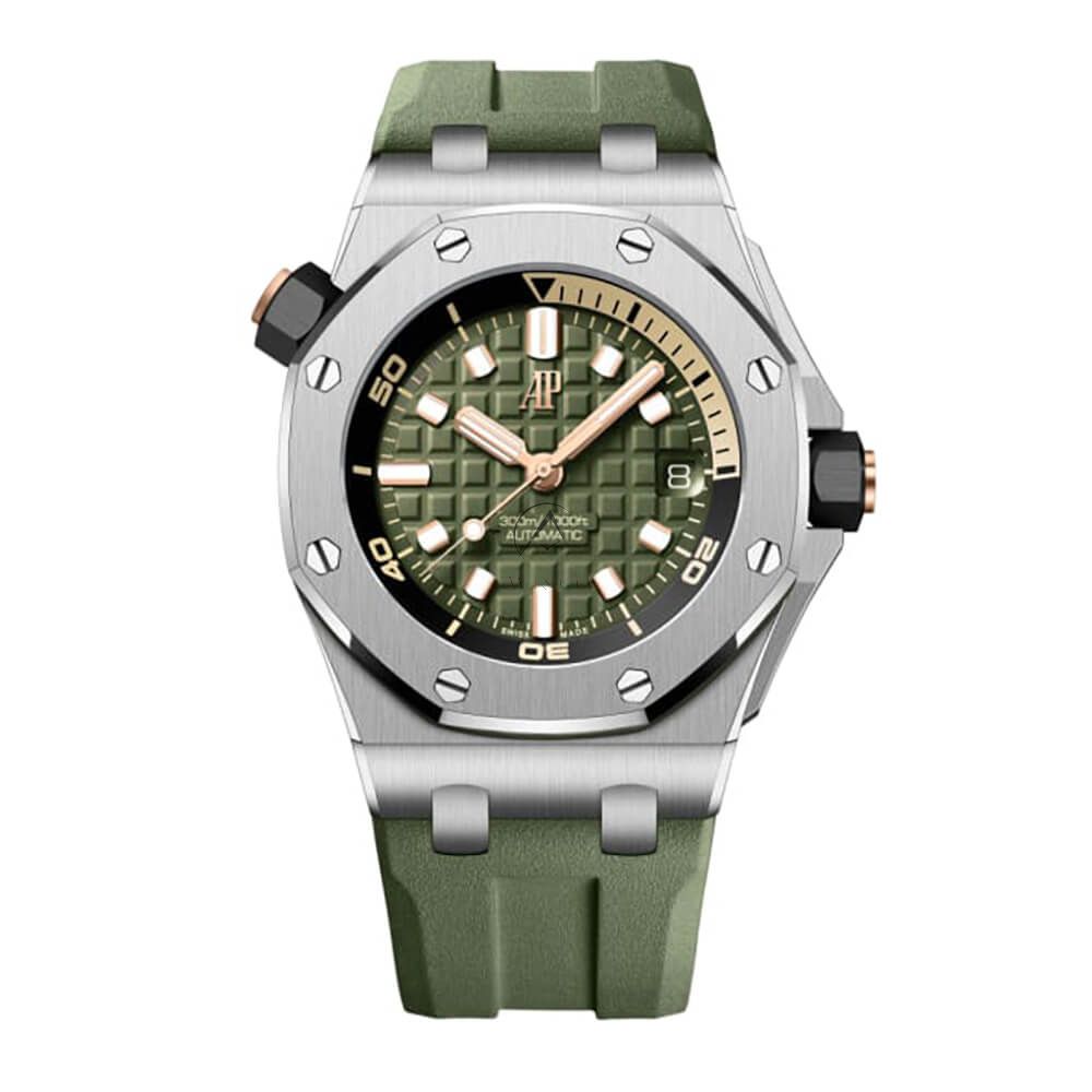 This exclusive Audemars Piguet Royal Oak Offshore has an eye-catching khaki green dial. The 42 mm stainless steel case is assembled with a dive time measurement and a water resistance of 984 feet. This timepiece is powered by the self-winding 4308 calibre with a 60-hour power reserve.