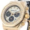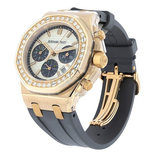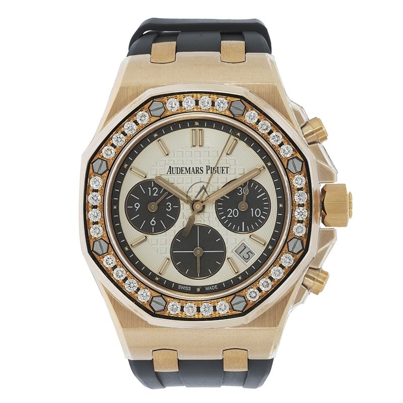 The Audemars Piguet Royal Oak Offshore highlights the rose gold and silver-toned octagonal dial contrast. The 18k rose gold 37 mm case is assembled with a diamond bezel, 37 jewels, and a water resistance of 165 feet. This timepiece has a 2385 calibre with a 40-hour power reserve.