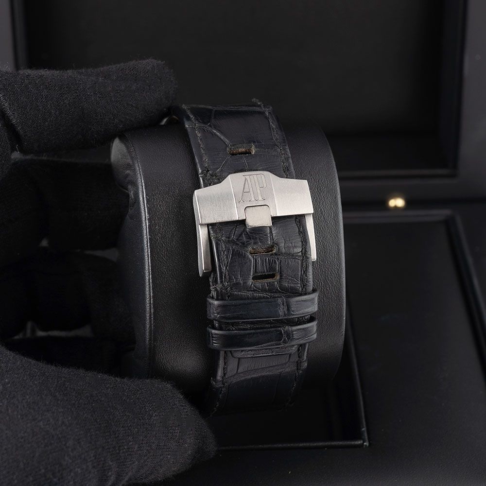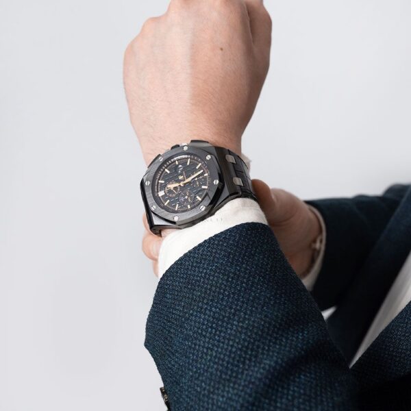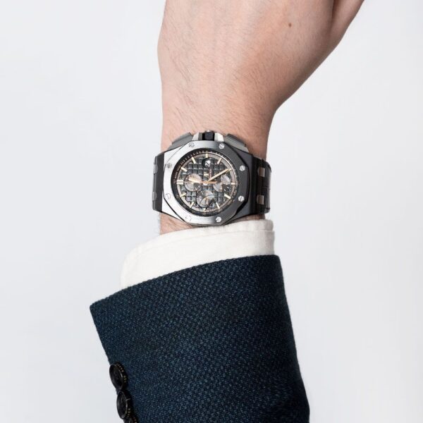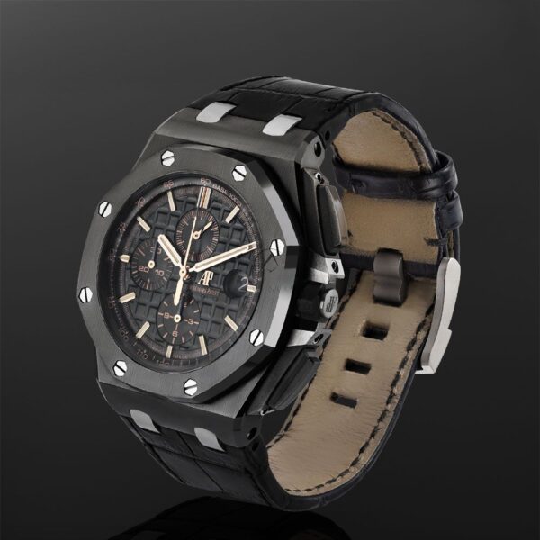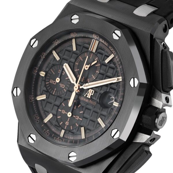 The Audemars Piguet Royal Oak Offshore Black Ceramic 44 26405CE.OO.A002CA.02 embodies both style and practicality. Its resilient brushed ceramic case, complemented by a black ceramic bezel and crown, along with sandblasted titanium buttons and button guards, creates a striking appearance.