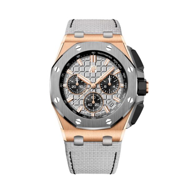 The Audemars Piguet Royal Oak Offshore 26420OI is a Titanium Chronograph with a Grey dial, measuring 43 mm in diameter. It features warm 18-carat pink gold tones complemented by a cool titanium bezel, all harmonizing with a contemporary grey “Méga Tapisserie” dial that matches the calfskin strap. The watch boasts an 18-carat pink gold case and titanium bezel, both with glare-proofed sapphire crystal and case back. Its black ceramic push-pieces and screw-locked crown, along with titanium push-piece guards and links, add to its durability and style. The Grey dial showcases a distinctive “Méga Tapisserie” pattern, black counters and external zone, pink gold applied hour-markers, and Royal Oak hands with luminescent coating, while a black inner bezel enhances its aesthetic appeal. As a flyback chronograph, it offers functions for hours, minutes, small seconds, and dates, and operates through a self-winding mechanism with a 70-hour power reserve.
