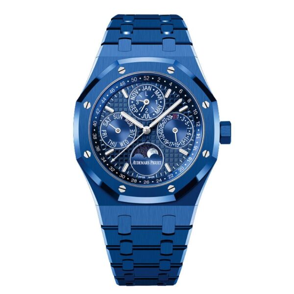 The Audemars Piguet Royal Oak 26579CS presents a stunning rendition of the Perpetual Calendar, draped entirely in blue. This 41mm timepiece marks the first occasion where both case and bracelet are meticulously crafted from blue ceramic, offering a seamless blend of style and durability.