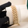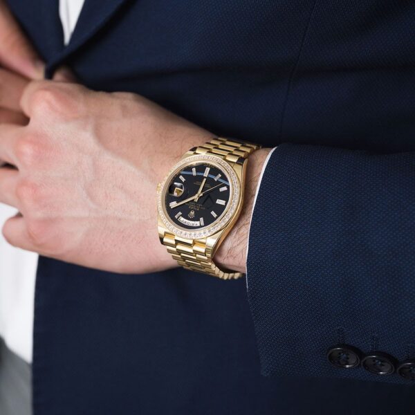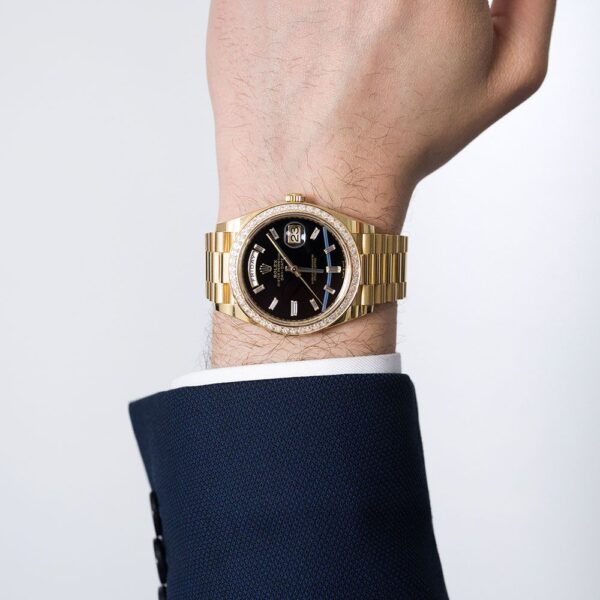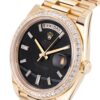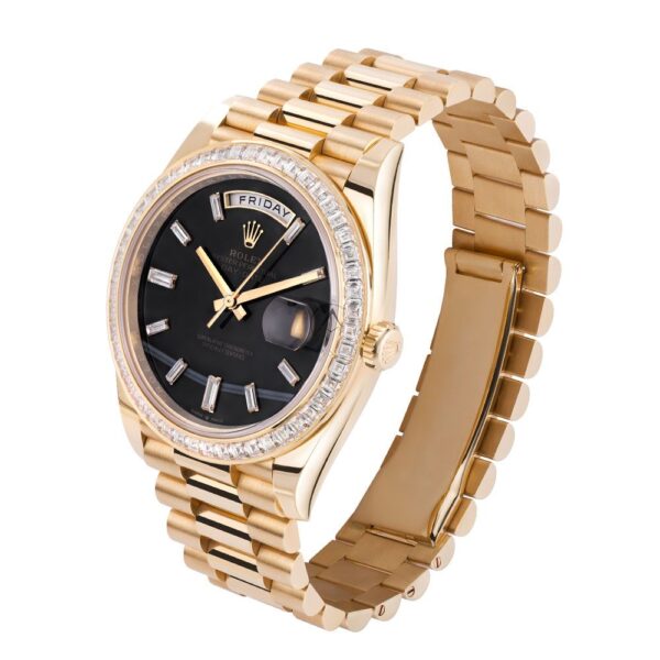 The Rolex Day-Date is a stunning timepiece that is sure to catch the eye with its exquisite diamonds that shine brilliantly in any setting. It features a 40mm case with a monobloc middle case, screw-down case back, and winding crown, as well as a diamond-set yellow gold bezel and a sapphire crystal. The black dial of this watch boasts ten baguette hour markers, a date window located at 3-o’clock and a day window at 12-o’clock. This watch runs on the signature Rolex caliber 3255, which provides instantaneous day and date functionality, precision of 2/+2 sec/day, and a power reserve of 70 hours. The case is paired with a president bracelet that features semi-circular three-piece links and a concealed folding crown clasp. This watch also has a water resistance level of 100 meters (330 feet).