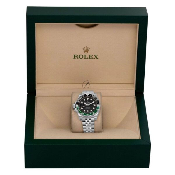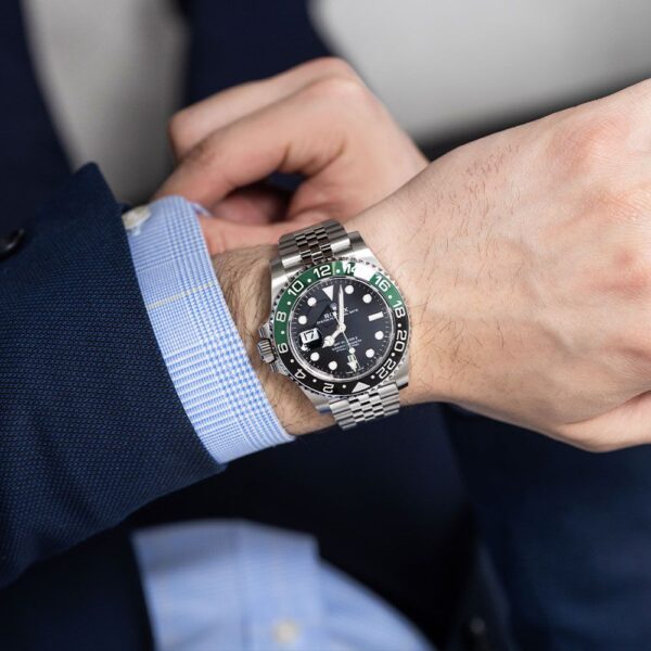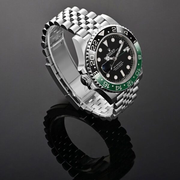 The Rolex GMT Master II Lefty, reference number 126720VTNR, is a distinctive timepiece embodying style and innovation. Featuring an Oystersteel Jubilee bracelet and housed in a 40mm Oyster case, this iconic watch effortlessly balances durability. The Black Dial adds a touch of timeless refinement, while the bi-color bezel in black and green, known as the “Sprite” bezel, enhances its distinct character.