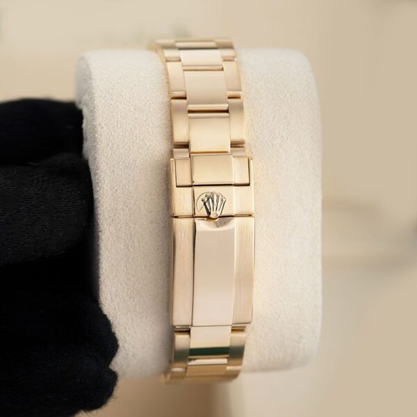 Introduced in 2005, the GMT became the perfect watch for the world traveler. The 40mm yellow gold case is assembled with a bidirectional ceramic bezel, an additional 24-hour hand, and a date window at 3 o’clock. Powered by the self-winding 3186 caliber, this timepiece has a 50-hour power reserve.