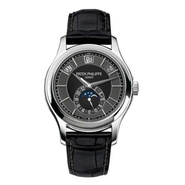 The Patek Philippe Complications 5205G-010 is a sophisticated timepiece featuring a 40mm 18K white gold case and a black dial with intricate details. Its self-winding mechanical movement offers exceptional precision and reliability, while its annual calendar function accurately tracks months and leap years. The watch’s water resistance of 120 meters (393 feet) ensures durability, making it suitable for various activities.