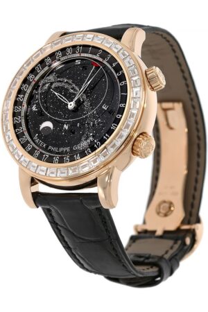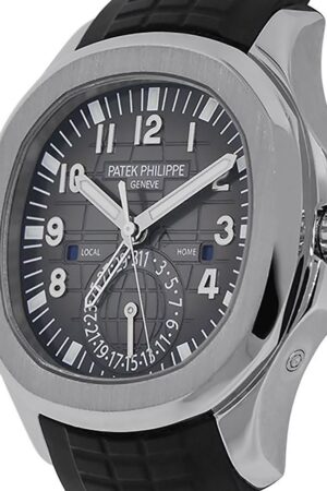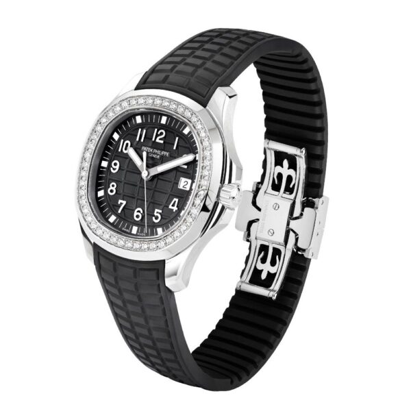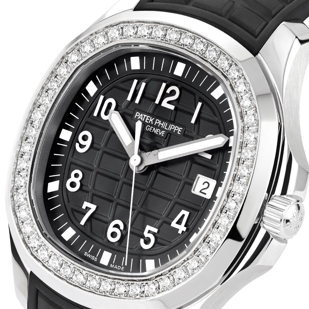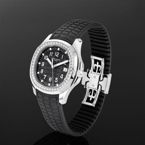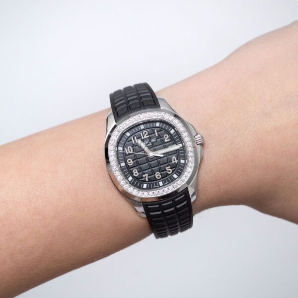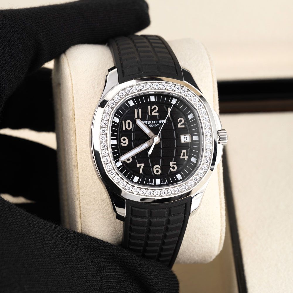 The Patek Philippe Aquanaut Quartz is a contemporary and chic timepiece. It features a stainless steel 38 mm case with a diamond-set bezel, a black dial, and a screw-down crown. Powered by the E 23-250 S C calibre, this watch includes a date display and has a water resistance of 120 meters (394 feet).