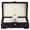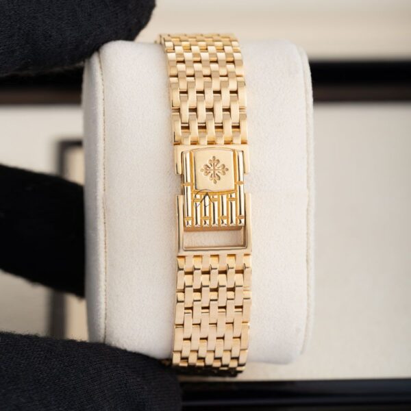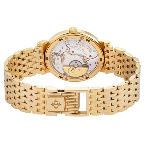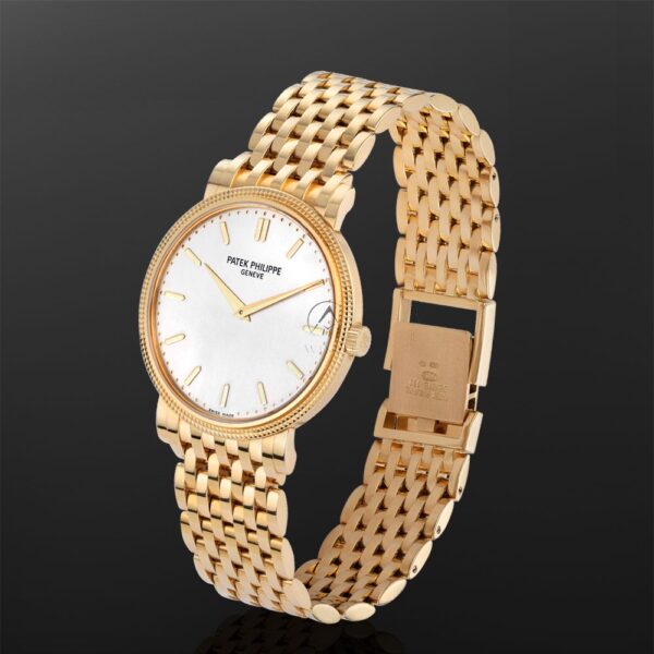 Patek Philippes Calatrava was created with an ultra-slim profile with the intention to be worn comfortably under the cuff of a buttoned shirt. This yellow gold 35 mm case is assembled with a silver gray dial. Powered by an automatic movement, this timepiece is has a water resistance of 98 feet.
