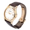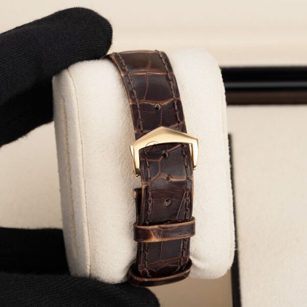 The Patek Philippe Calatrava 5127R-001 men’s watch boasts a case of 37mm made of luxurious 18K rose gold. The case is complemented by a smoothed bezel of the same material, enhancing its refined aesthetic. The silver dial is adorned with rose gold hands and index hour markers, with the date displayed elegantly at the 3 o’clock position. Minute markers grace the outer dial, offering precise timekeeping. The watch is secured by a black leather strap with an 18K rose gold buckle, designed to fit wrists up to 7.5 inches. Encased in scratch-resistant sapphire crystal, both the front and back offer transparent views, revealing the intricate automatic self-winding movement within. This timepiece comes with its original box and papers, along with an extra black leather strap.