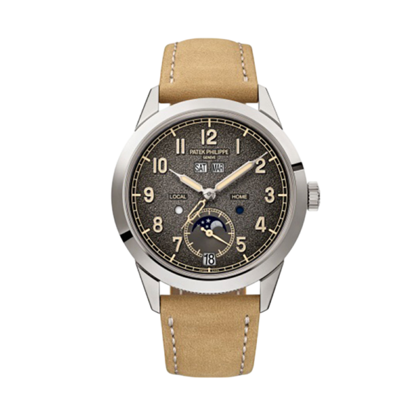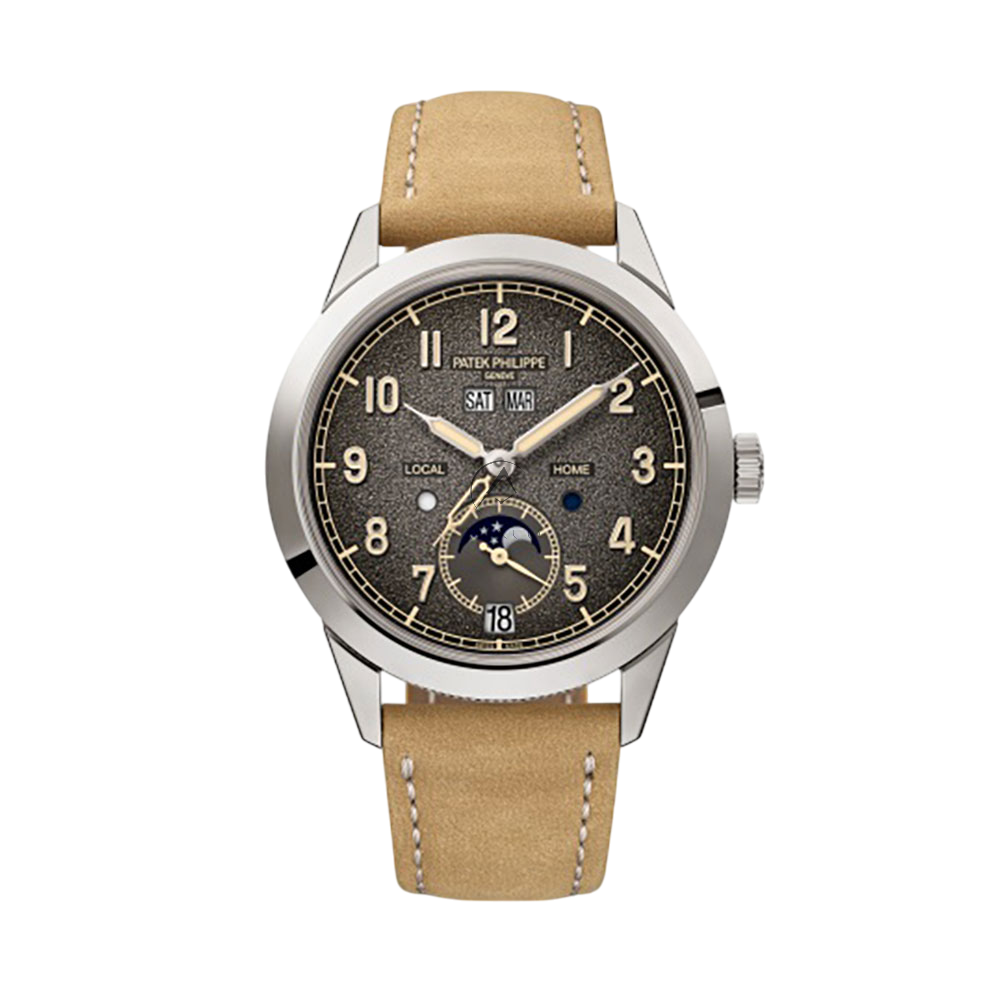 Patek Philippe combines the patented annual calendar and the travel time display system for the first time. The white gold 41 mm case is assembled with a textured, charcoal gray dial with gold-applied numerals. This timepiece is powered by the self-winding 31-260 PS QA LU FUS 24H calibre with a water resistance of 98 feet.