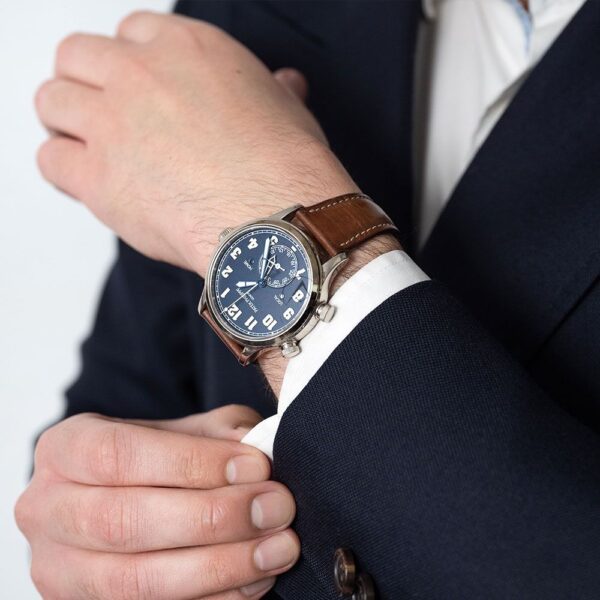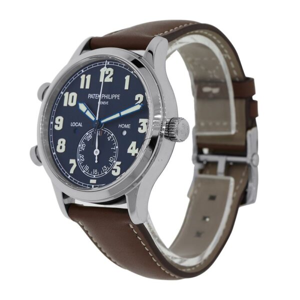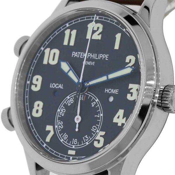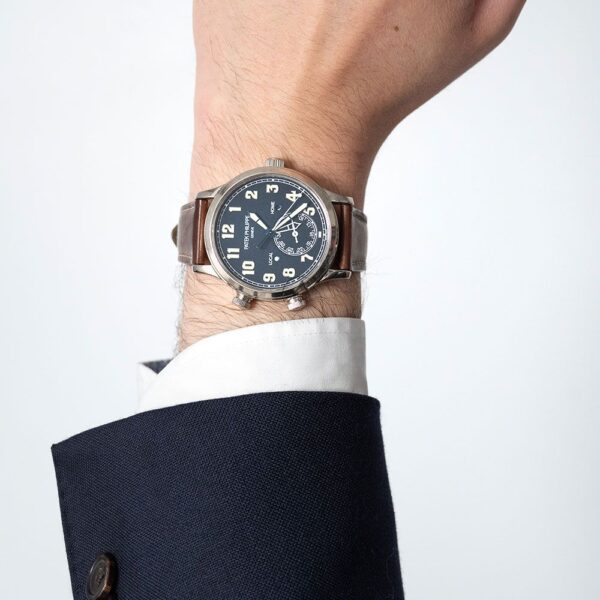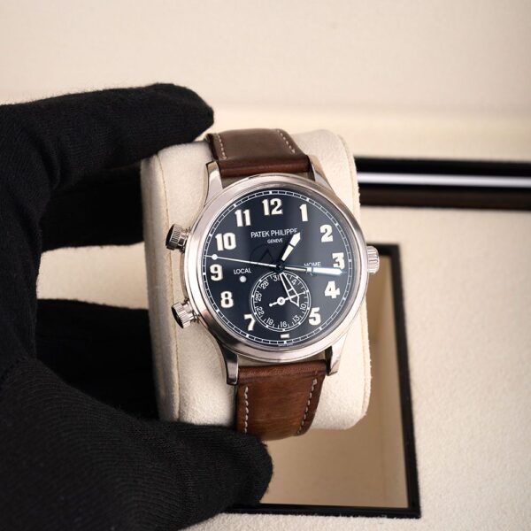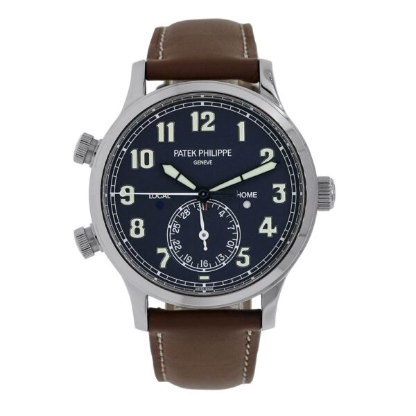 If you frequently travel across the world and love adventure, the Complications Calatrava Pilot Travel Time watch from Patek Philippe is an excellent option for you. It features a 42mm case made of white gold and a blue varnished dial with gold-applied numerals and luminescent coating. This watch is self-winding and powered by the 26-330 S C FUS calibre. Additionally, it has a water resistance of up to 196 feet.