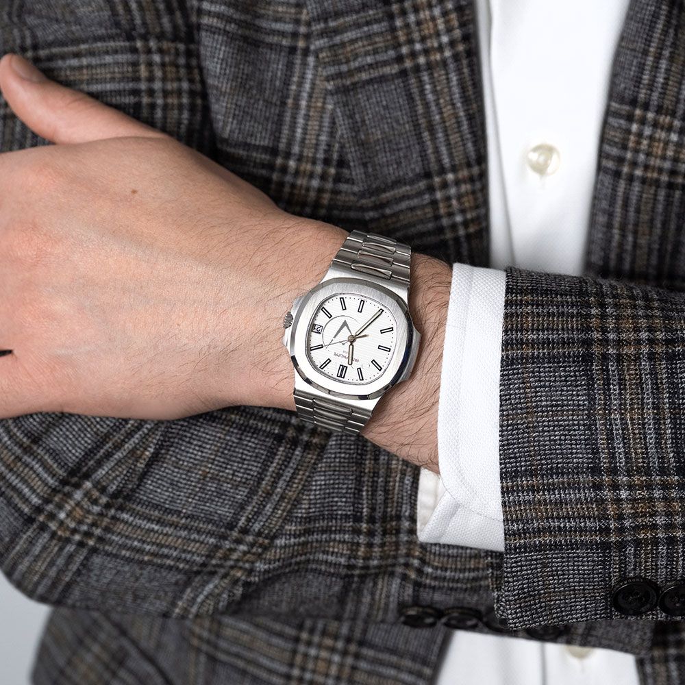 The Patek Philippe 5711/1A-011 Nautilus was first introduced in 1978. At a time when watch cases were getting thinner, the Nautilus went against this trend and soon became one of the brand’s most iconic watch models. This exquisite watch case is crafted in stainless steel, measuring 40 mm. It houses the Caliber 324 S C self-winding automatic movement with a 45-hour power reserve. The gradated dial is white with raised gold-applied luminescent markers and a date display at the 3 o’clock position. The bracelet is also made of stainless steel with brushed finished links, complemented by bright polished links in the center. It attaches to the wrist with a double-fold over deployment clasp.