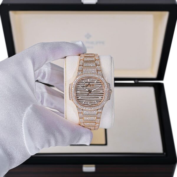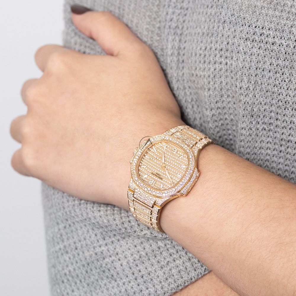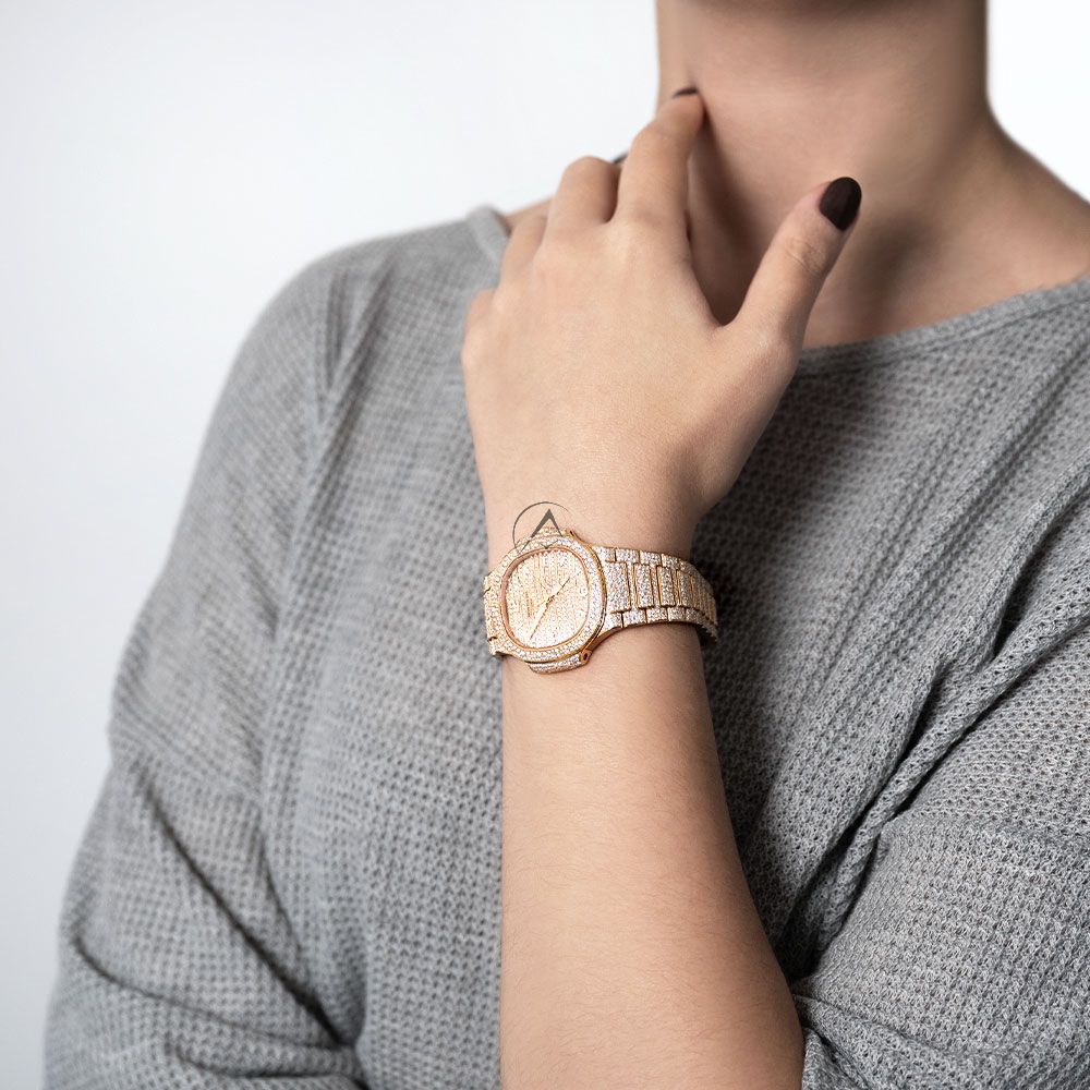 This exquisite Patek Philippe Nautilus Haute Joaillerie is a must-have for any woman. Adorned with 2,553 diamonds, the watch’s pav setting is a stunning display of craftsmanship. The 35mm rose gold case features a gem-set bezel and offers a water resistance of 98 feet. Powered by the reliable 324 S caliber, this timepiece boasts a 45-hour power reserve.