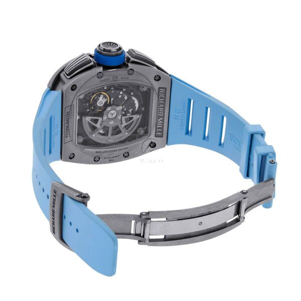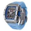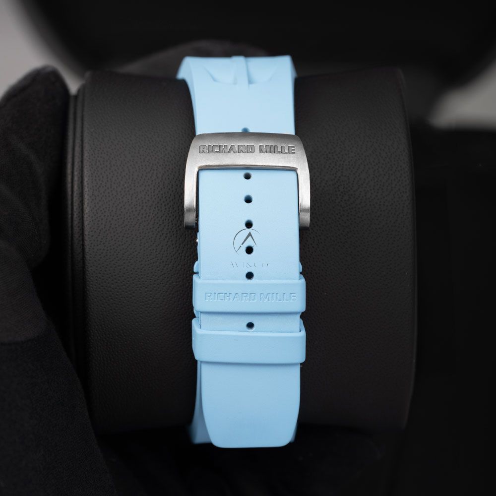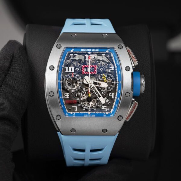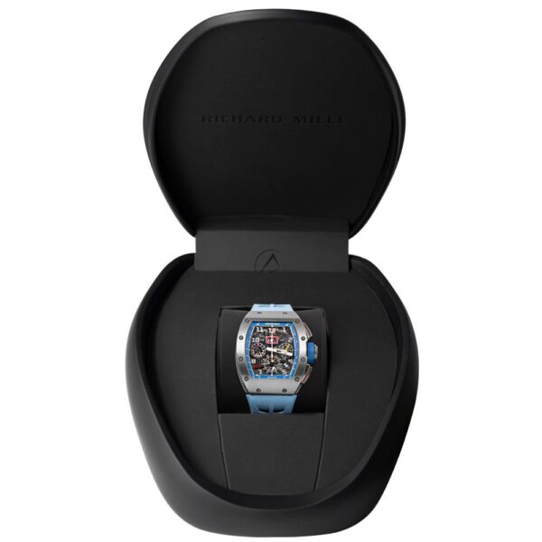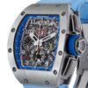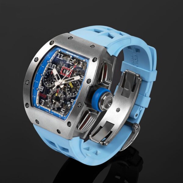 Richard Mille released a 30-piece limited edition of this exclusive blue RM011 Felipe Massa for the Americas market. The titanium, tonneau 49.94 x 44.50 mm case is assembled with a tachymeter bezel, flyback chronograph with 60-minute countdown timer, 12-hour totalizer, and oversize date and month functionality. This timepiece is powered by the RMAC1 calibre with a 50-hour power reserve.