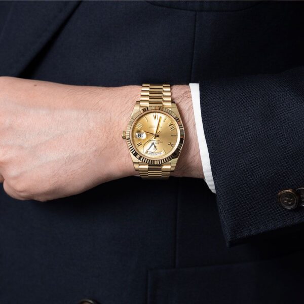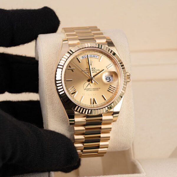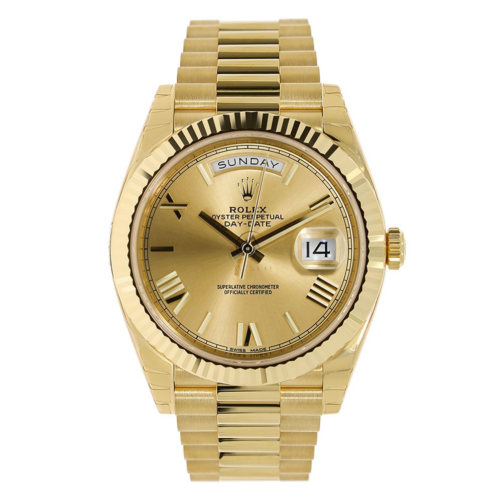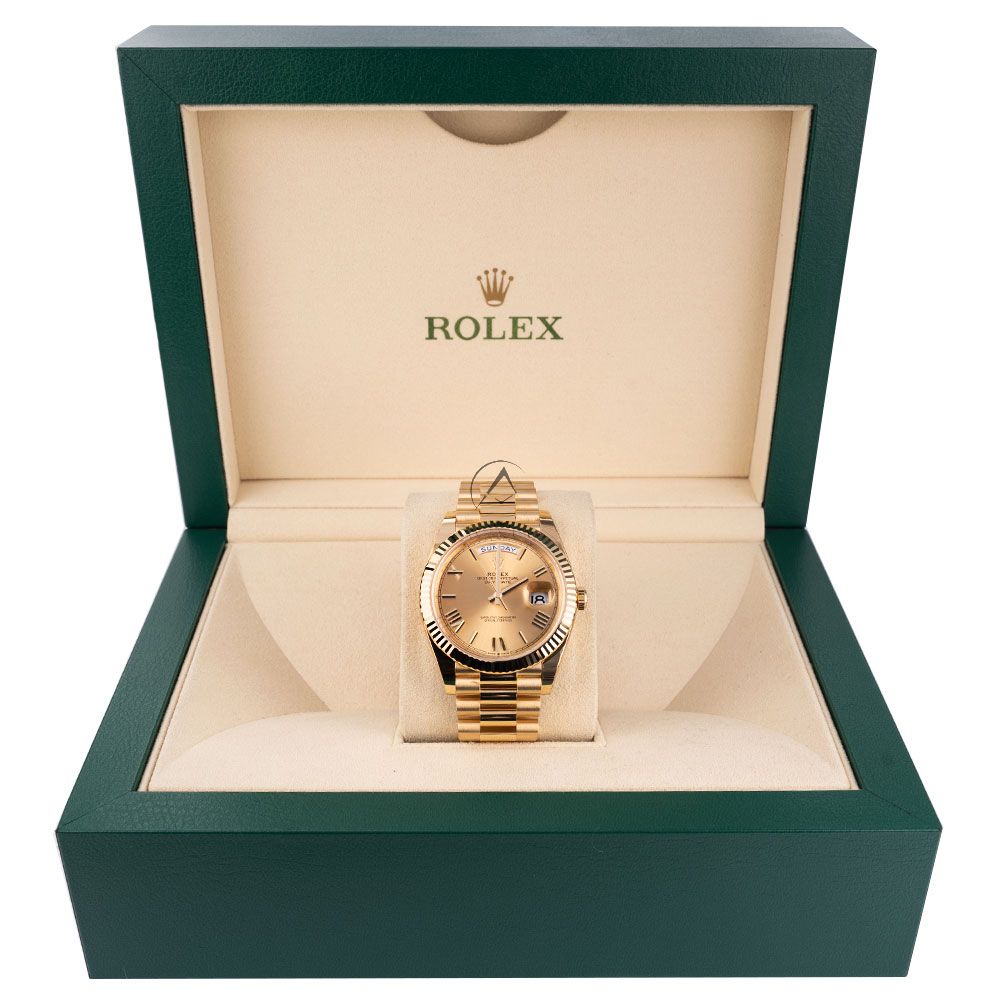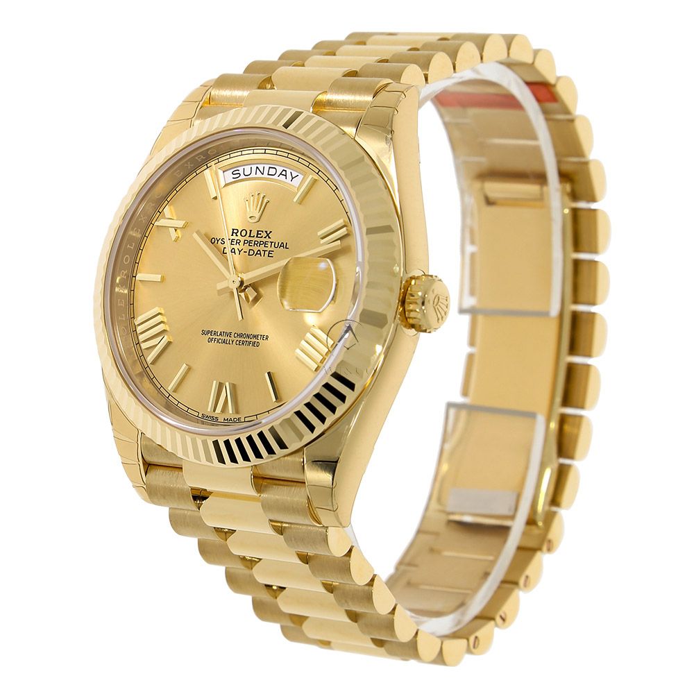 The Rolex Day-Date 40 reference 228238 is a luxurious timepiece that sets a new benchmark. This elegant watch features a champagne dial with yellow gold components. The case of this watch measures 40mm and has a monobloc middle case, screw-down case back, and winding crown. It also has a sapphire crystal and a fluted yellow gold bezel. The champagne dial is adorned with yellow gold Roman numeral hour markers and hands. The Rolex Day-Date 40 reference 228238 is powered by the signature Rolex caliber 3255, which has an instantaneous day and date function, a precision of 2/+2 sec/day, and a power reserve of 70 hours. The watch comes with a president bracelet, which has semi-circular three-piece links and a concealed folding crown clasp. It has a water resistance of 100 meters (330 feet).