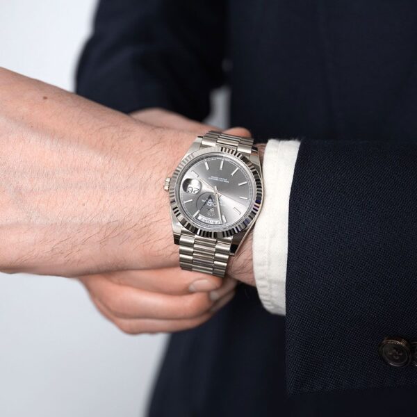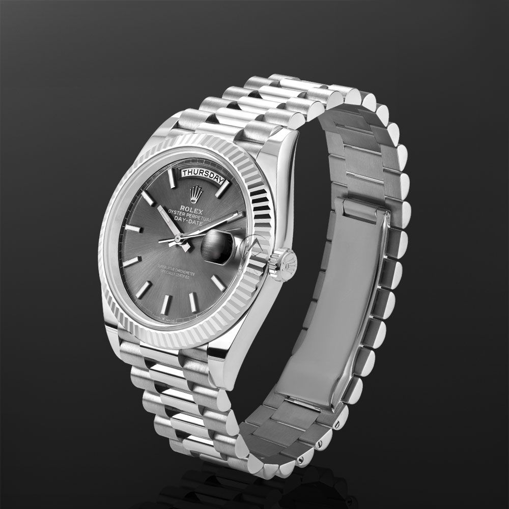 The Rolex Day-Date 40, with model number 228239, is made of 18K white gold and features a slate grey index dial within its 40mm case. It is powered by an automatic movement, specifically the Caliber 3255, which provides a generous 70-hour power reserve. This timepiece has a distinguished appearance with its fluted bezel and is complemented by a President bracelet, enhancing its timeless elegance.