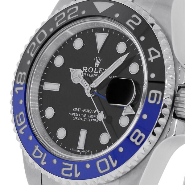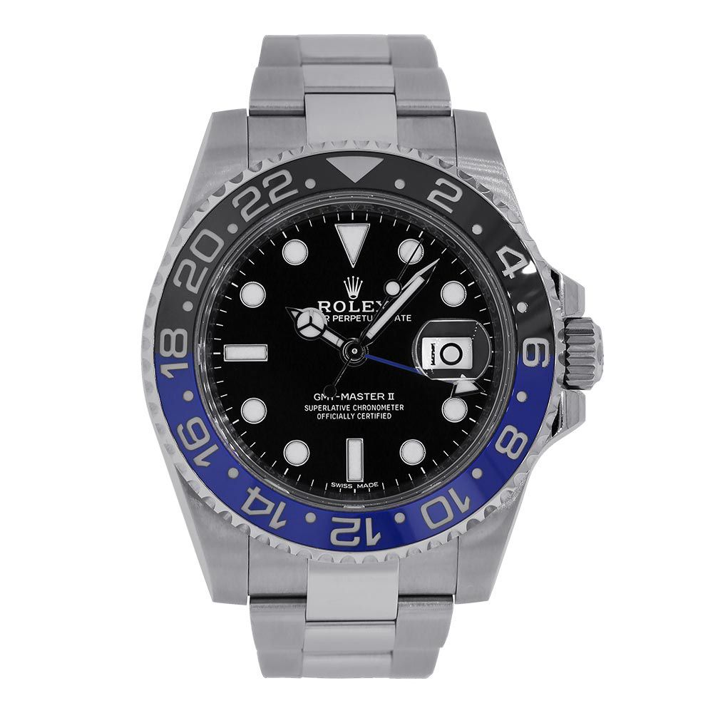 The highly coveted Batman Rolex was the first Rolex watch to have a bi-colored ceramic bezel introduced at Baselword 2013. The two-tone design was created to differentiate between daylight and nighttime hours in the second time zone, perfect for the world traveler. The stainless steel 40 mm case is assembled with a screw-down case back and a winding crown. This timepiece is powered by the self-winding 3186 calibre with a 50-hour power reserve.