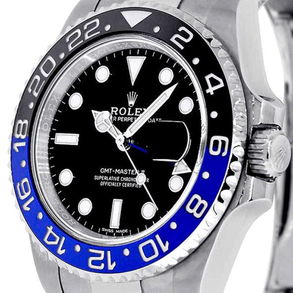 Built with performance in mind, the “Batman” features a robust 40mm stainless steel case with a screw-down back and crown, ensuring water resistance up to 100 meters. A scratch-resistant sapphire crystal protects the sleek black dial with luminous hour markers and a contrasting blue GMT hand. The bi-directional bezel, crafted from black and blue ceramic with engraved numerals, allows for intuitive time zone adjustments.