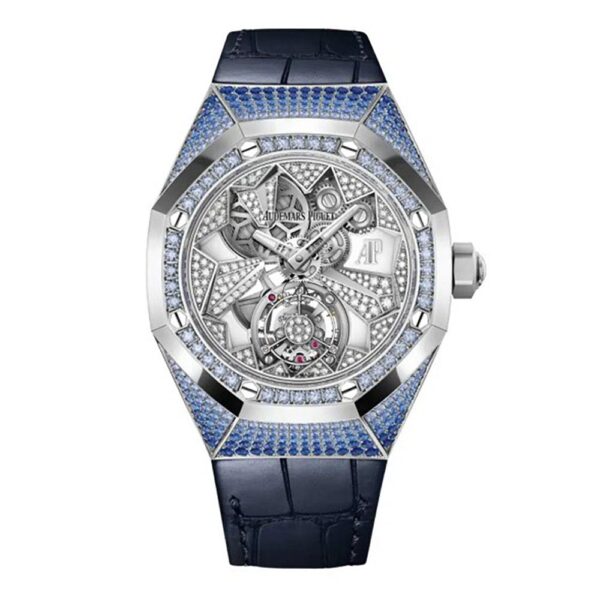 The Royal Oak Concept collection’s bold steampunk design celebrates architecture in all its forms. The 38.5mm 18k white gold case features a bezel adorned with brilliant-cut graded blue sapphires, a crown set with a translucent sapphire cabochon, and a hand-stitched blue alligator strap with a “large square-scale” pattern. Powered by the hand-wound 2951 caliber, this timepiece offers a power reserve of 77 hours.