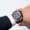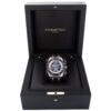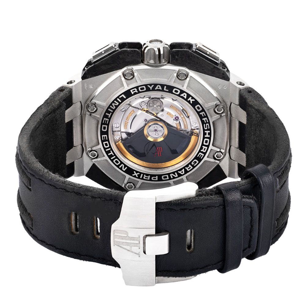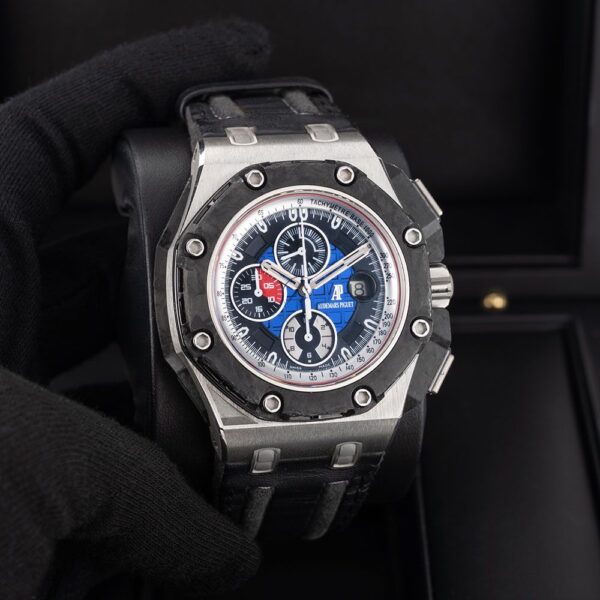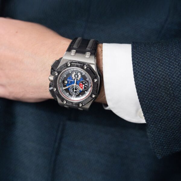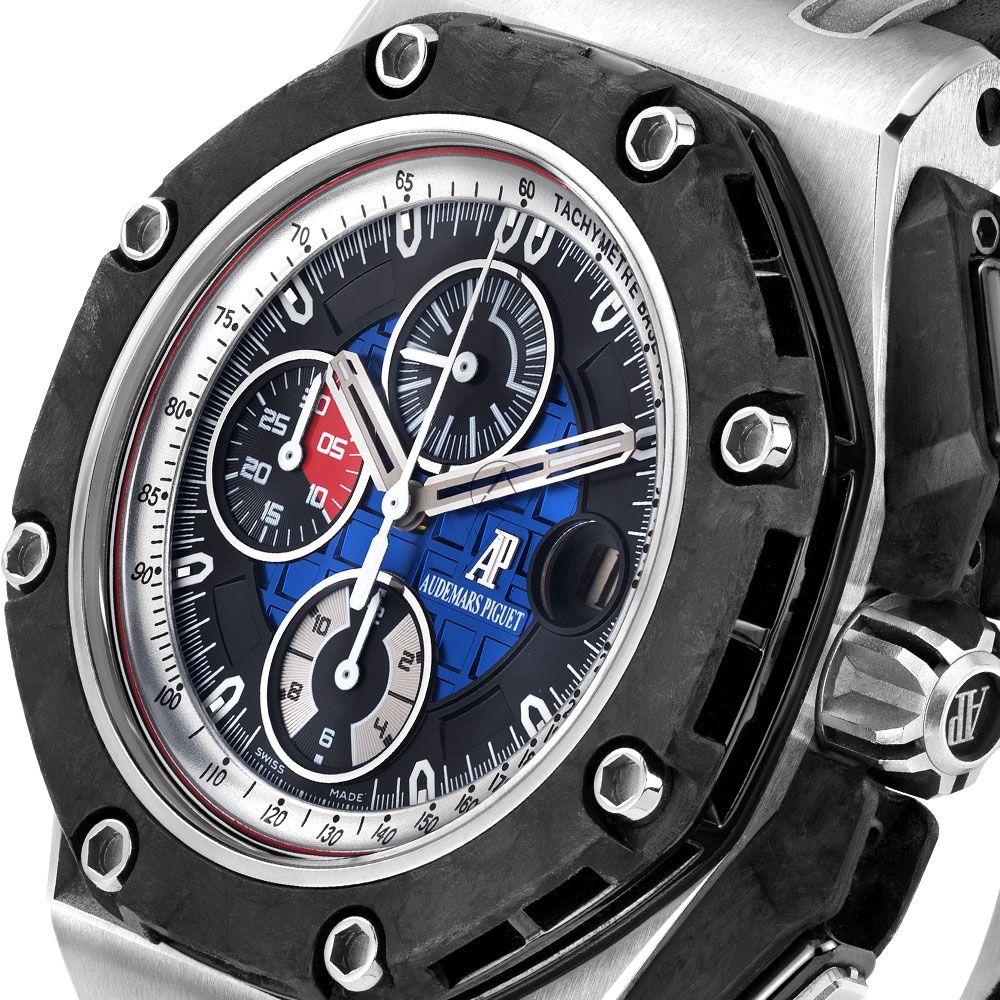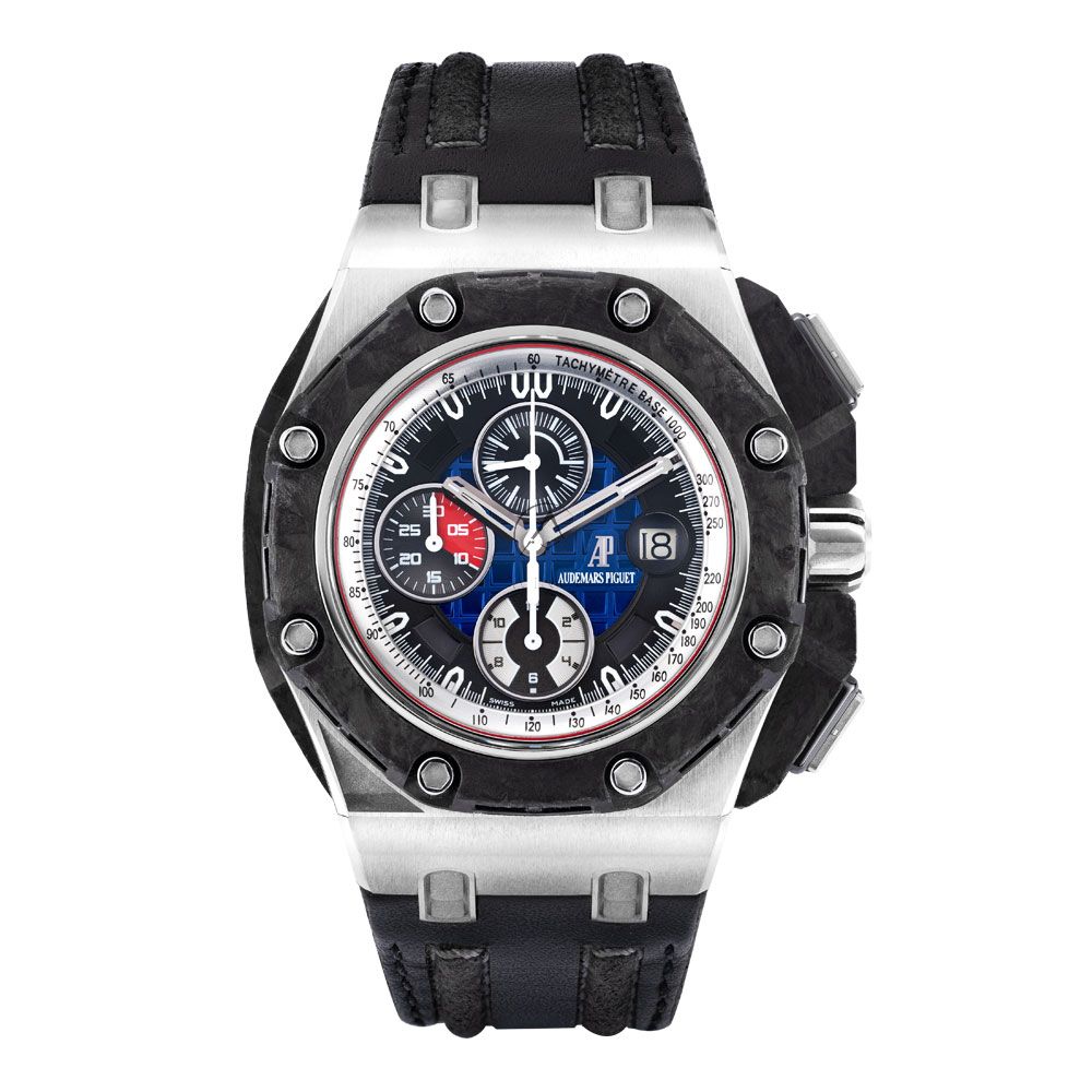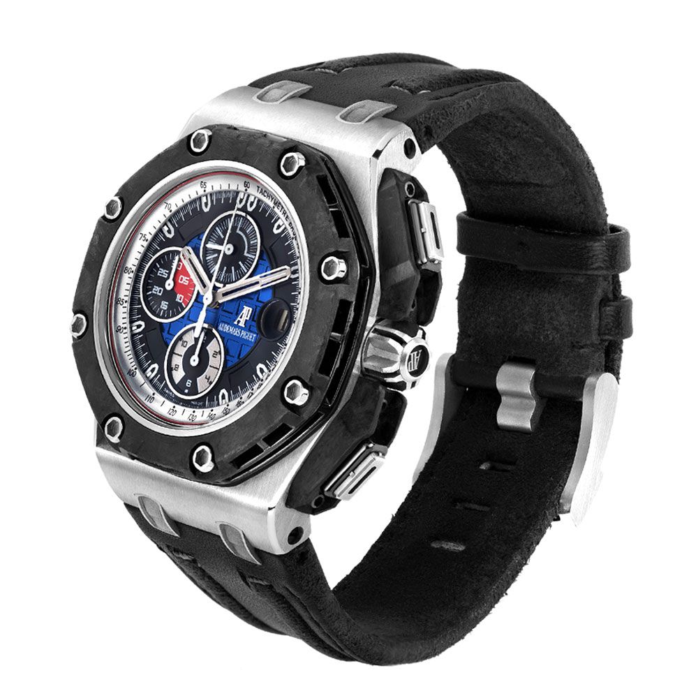 The Audemars Piguet Royal Oak Offshore Grand Prix Chronograph (26290POOOA001VE01) is a limited edition (75 pieces) self-winding automatic watch featuring a 44mm platinum case and a striking black and blue dial with the iconic Mega Tapisserie pattern. Protected by a black forged carbon bezel and secured on a black leather strap with a platinum tang buckle, this timepiece offers hours, minutes, seconds, date, and chronograph functions. With a water resistance of 50 meters (5 ATM) and serviced with original box and papers, this watch is a luxurious statement piece.