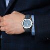 The Patek Philippe Aquanaut Travel Time Reference 5164 is a sophisticated travel companion. Its 41mm white gold case houses an opaline blue-gray dial with the signature Aquanaut pattern. The self-winding Caliber 26-330 S C FUS powers dual time zone functionality and a date display. The comfortable composite strap and 30-meter water resistance make this watch both stylish and practical.