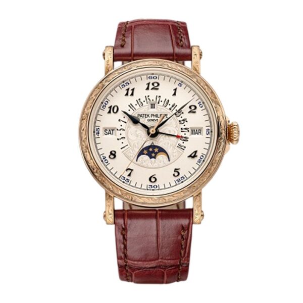 The Patek Philippe Retrograde Perpetual Calendar Rare Handcrafts Reference 5160/500 is a masterpiece of horology, featuring a 38mm rose gold case adorned with intricate hand-engraved decorations. The silvery opaline dial showcases a retrograde date hand, day, month, and leap year indicators. Powered by the self-winding Caliber 26-330 S QR movement, this timepiece offers exceptional precision and a water resistance of 30 meters.