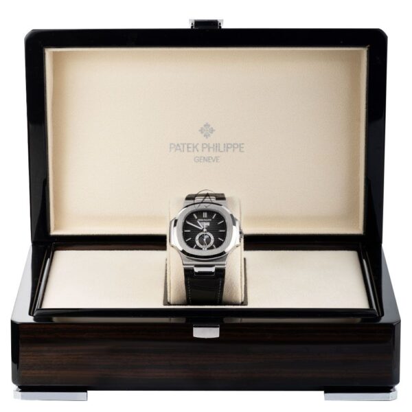 This Patek Philippe timepiece is a sophisticated tool watch that can keep track of time in multiple ways. It features a classic black dial with luminous gold hour markers for easy reading in low light conditions. The 40mm stainless steel case is water-resistant up to 394 feet, making it suitable for everyday wear and even light swimming. The automatic movement provides a 45-hour power reserve, ensuring the watch keeps running even when not worn for a day or two.