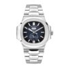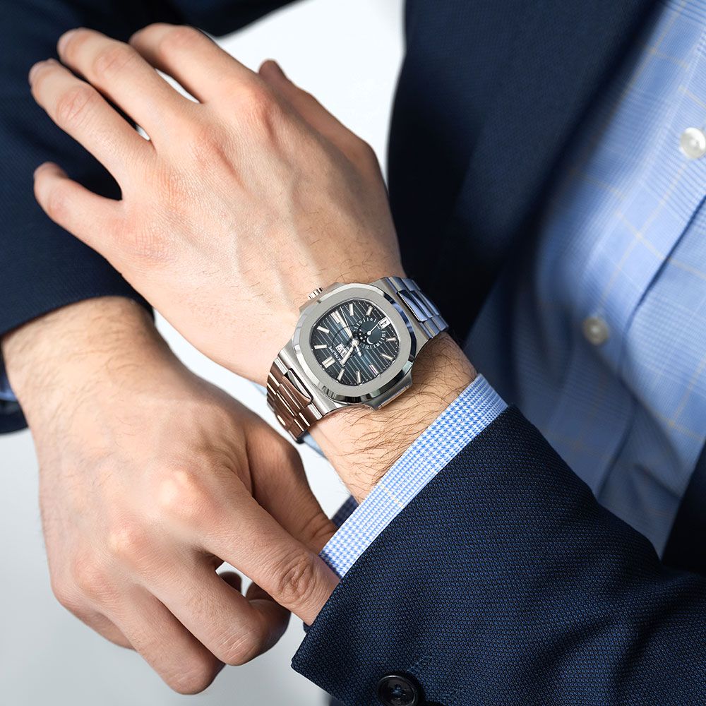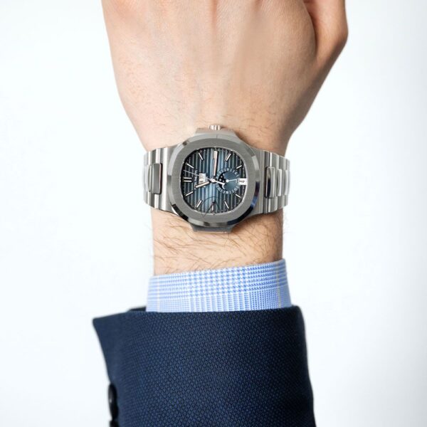 The Patek Philippe Nautilus comes in a stunning new blue dial reminiscent of the 1976 original. The 40mm stainless steel case is built for durability with a fixed bezel and water resistance up to 394 feet, making it suitable for everyday wear or even swimming. The automatic movement provides a 45-hour power reserve, ensuring the watch keeps running even when not worn for a over a day.