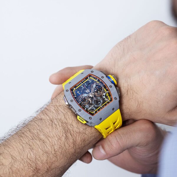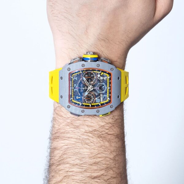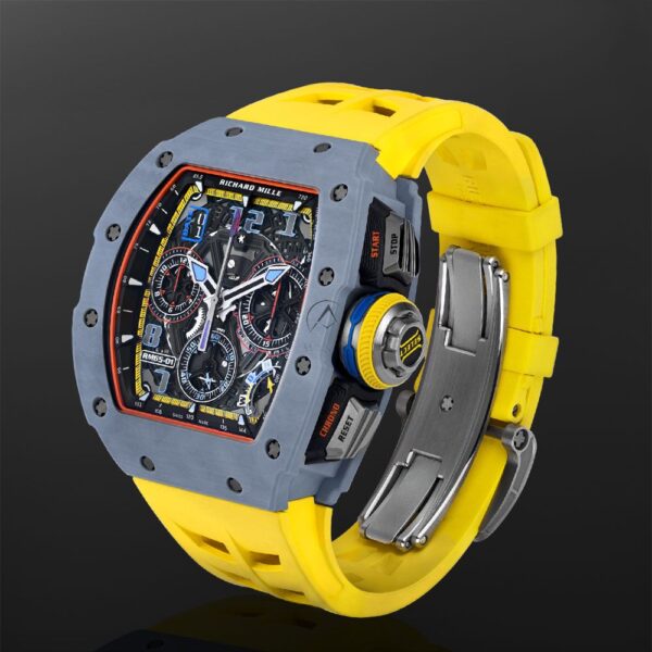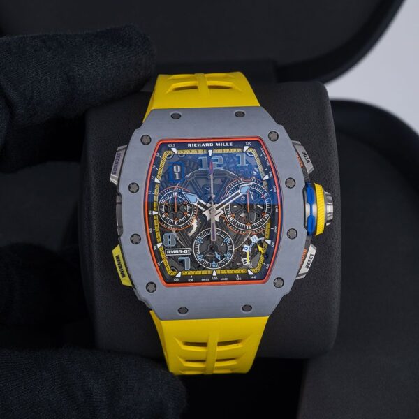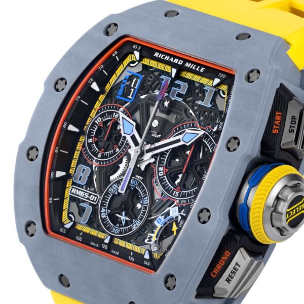 The Richard Mille RM 65-01 Split-Seconds Chronograph is a stunning timepiece featuring a 50mm Carbon TPT case and a skeleton dial. Powered by the in-house Caliber RMAC4, this watch boasts a state-of-the-art split-seconds mechanism and a newly implemented column wheel. The lightweight titanium baseplate ensures durability without compromising performance.