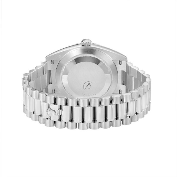 The 2024 Rolex Day-Date 40, 228236, President, Platinum, Ice Blue Roman Dial, 40 mm, is a timeless and prestigious timepiece. Its 40mm platinum case, fluted bezel, and ice blue Roman dial create a stunning and luxurious appearance. The watch is powered by the self-winding Caliber 3255 movement, offering exceptional precision and a power reserve of up to 70 hours.